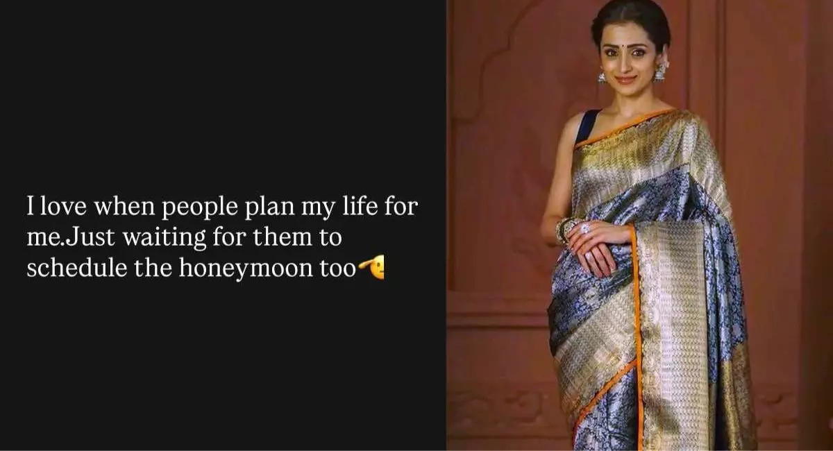 ఈ రూమర్స్ను కొట్టిపారేస్తూ.. త్రిష వెంటనే తన స్టైల్లో సెటైర్ వేస్తూ ఇన్స్టాగ్రామ్ స్టోరీస్లో పోస్ట్ చేసింది. మీడియానే తన హనీమూన్ డేట్ను కూడా ఫైనల్ చేయాలని కోరింది. త్రిష పేరు మ్యారేజ్ స్పెక్యులేషన్స్లో ఇరుక్కోవడం ఇదేం కొత్త కాదు. రీసెంట్గా, తమిళ సూపర్ స్టార్ తలపతి విజయ్తో లింక్-అప్ ఉందనే వార్తలతో ఆమె హెడ్లైన్స్లో నిలిచింది.